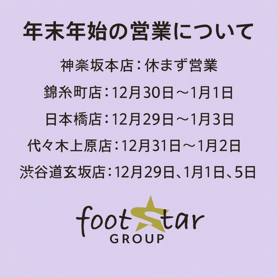 2025.12.30Footstarグループ年末年始のお知らせ 距骨サロンFootstarグループ(神楽坂本店・錦糸町店・日本橋店・代々木上原店・渋谷道玄坂店)は以上のような日程で営業しております。まだ予約可能なところもありますのでお早めにご相談ください ニュース一覧に戻る